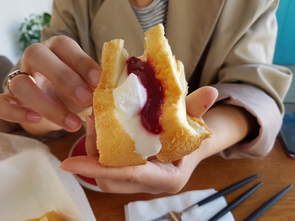 왼쪽 조각은 삶은계란을 으깨서 넣은거였고, 오른쪽은 크림에 딸기잼같은게 추가되었습니다