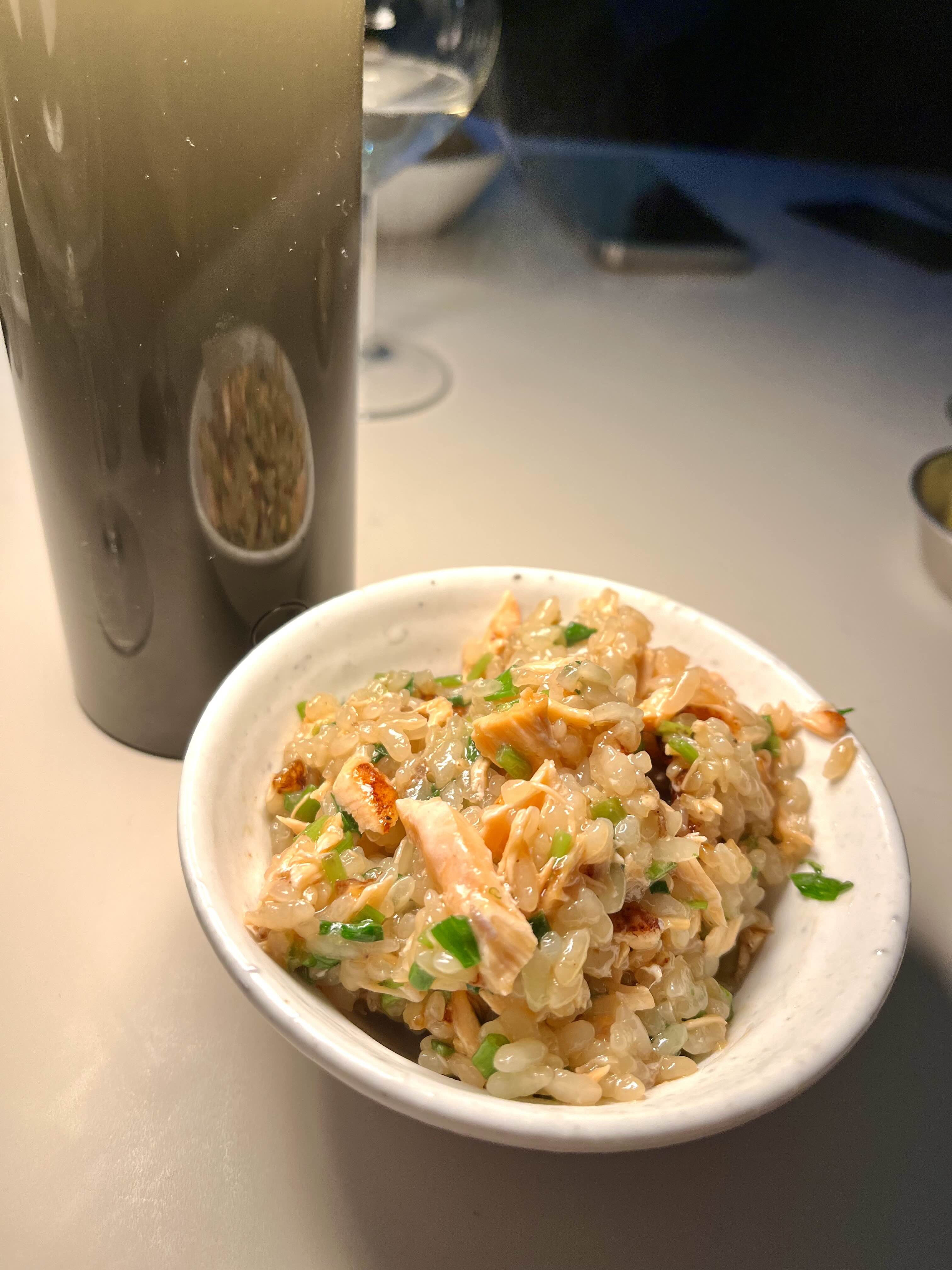 연어솥밥은 연어스테이크가 통으로 올라간 솥밥으로
