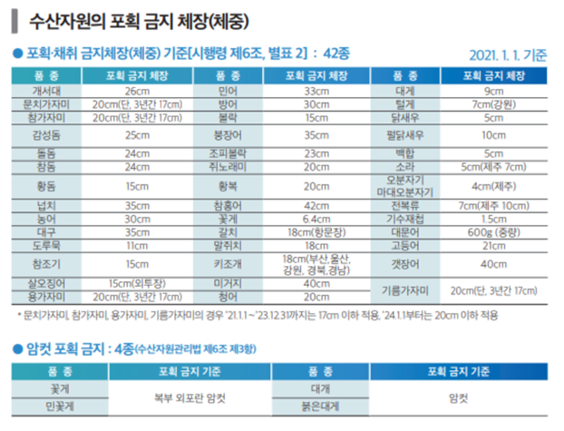 수산자원의 포획, 채취 금지기간 및 체장(체중)은