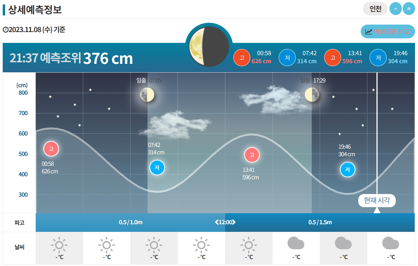 이렇게 조석예보 및 예측정보 등 다양한 정보들을 얻으실 수 있습니다.