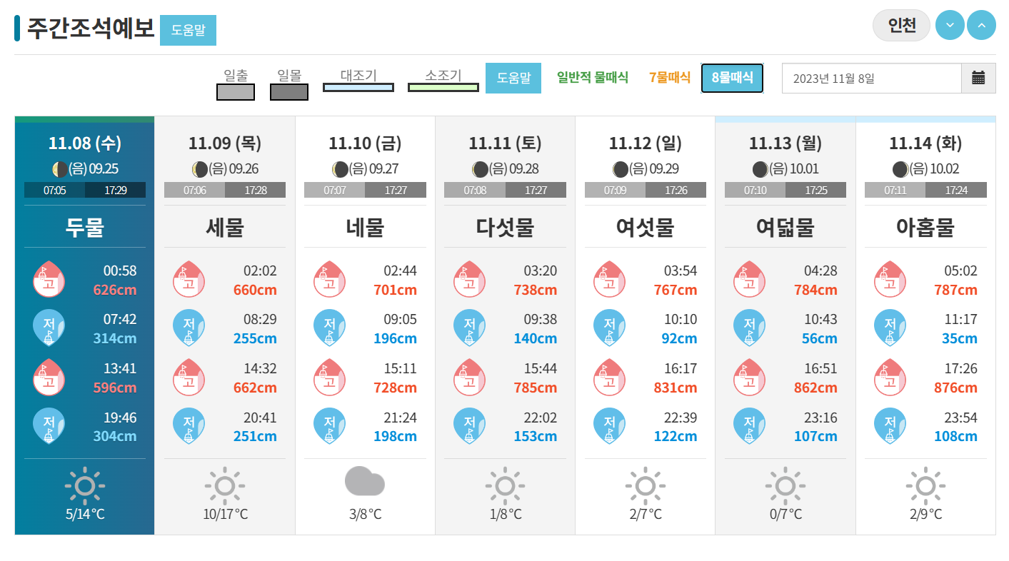 이와 같이 조석현상의 총체적인 파악이 물때입니다.