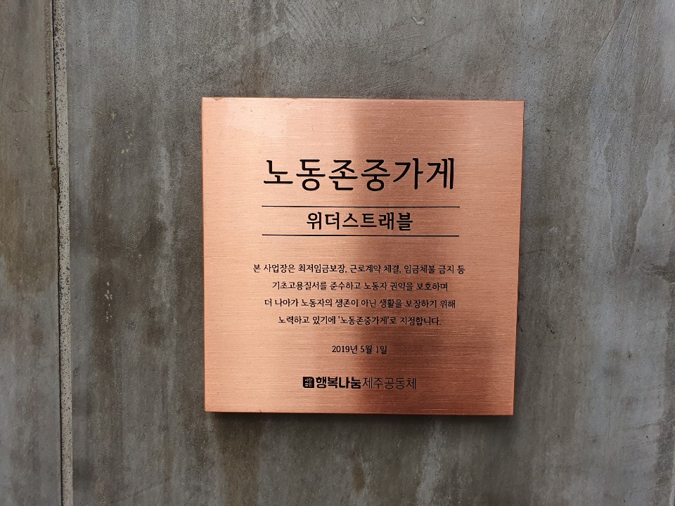 본 사업장은 최저임금보장, 근로계약 체결, 임금체불 금지 등 기초 고용질서를 준수하고 노동자 권익을 보호하며 더 나아가 노동자의 생존이 아닌 생활을 보장하기 위해 노력하고 있기에 '노동존중 가게'로 지정한다는 패가 달려있네요!