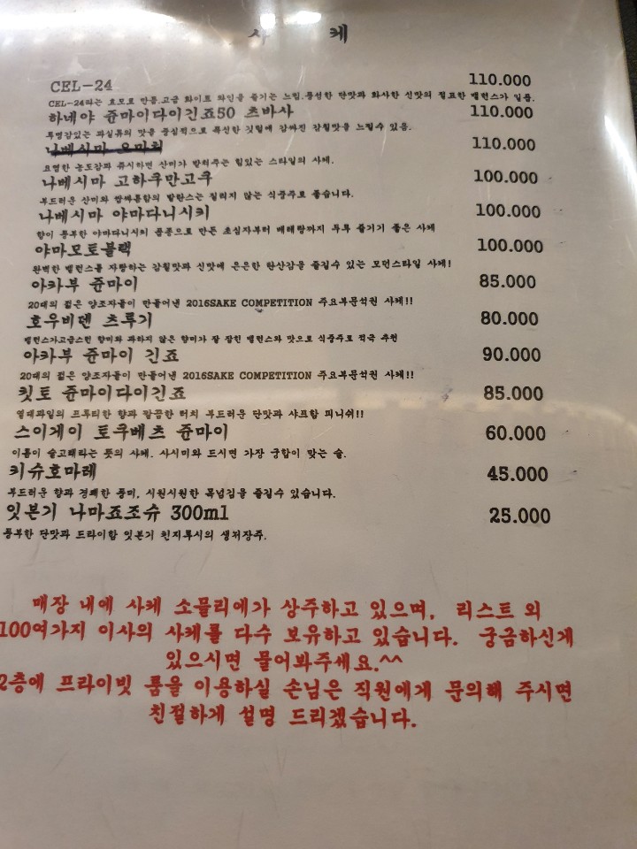 보통의 이자카야 메뉴들과 비슷하게 판매되고 있으며, 가격들 또한 비슷하게 판매가 되고 있습니다