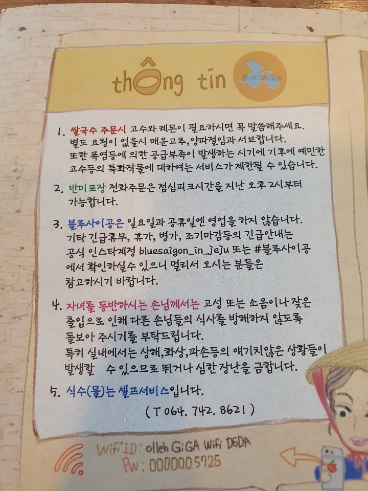 블루사이공은 일요일과 공휴일엔 영업을 하지 않습니다 기타 긴급 휴무, 휴가, 병가, 조기마감 등의 긴급 안내는 공식 인스타계정에서 확인하실 수 있으니 멀리서 오시는 분들은 참고하시기 바랍니다